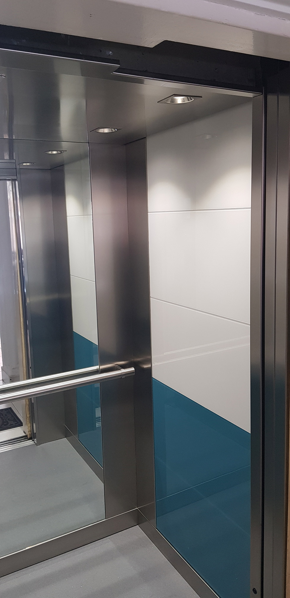 Harmadik ütem: felvonó fülke burkolása egyedi tervezés alapján, üveg burkolattal, süllyesztett világítással.